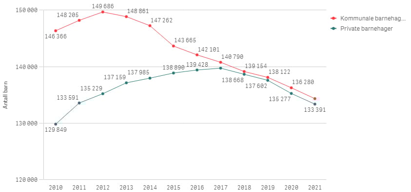 Siden 2017 har det vært like stor nedgang i antall barn i private som i kommunale barnehager.
